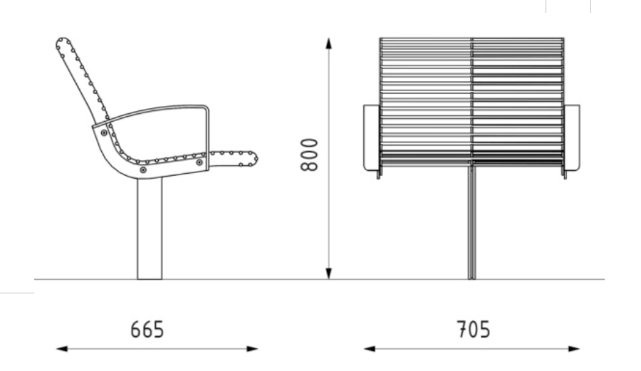 Bænken består af en svejset base af rustfrit stål på et ben fremstillet af dele af rustfrit stål. Sædet er fremstillet af 34 stk. stænger med en diameter på 10 mm, som er svejset fra en metalplade med en tykkelse på 5 mm. Benene er derefter svejset fra en metalplade med tykkelse på 8+5+8 mm. Armlæn er boltede til siderne af sædet ved hjælp af 6 M8-skruer af rustfrit stål.