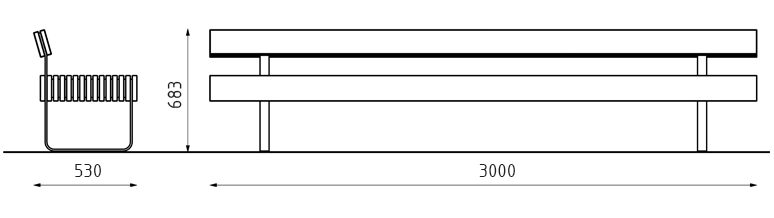En massiv bænk bestående af træbrædder og understøttende stålkonstruktion. Sæde og ryglæn er fremstillet af massivt træ. Konstruktionen består af to ben, som er bøjet fra strimler på 50 x 10 mm og som bærer skjulte gevindstænger. Gevindstængerne trækker træbrædderne i mellemlag med metalplade på 10 mm og gummistykker sammen. Sædet og rygstøtten er fremstillet af i alt 17 rektangulære (26 × 140 mm) brædder med en længde på 3000 mm i ThermoWood®-fyrretræ.