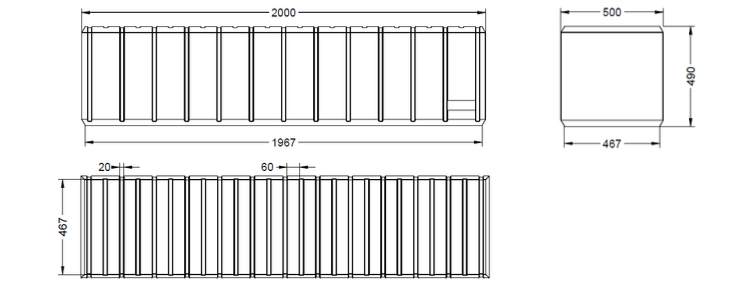 Bænken er lavet af UV-stabil polyethylen. Bænken fåes i hvid, grå og sandfarvet. Bænkens overflade er formet som lameller.